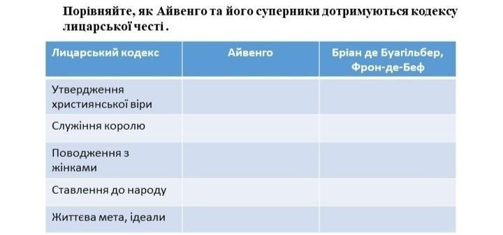 Айвенго: Він намагається відновити свою родову славу і дотримується ідеалів лицарства, таких як відвага, чесність і вірність.
