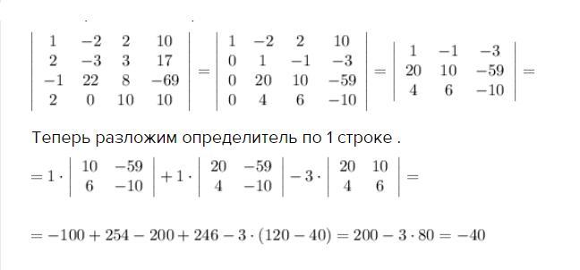 Сначала в первом столбце сделаем три нулевых элемента . Для этого 1 строку умножим на (-2) и сложим со 2 строкой , сложим 1 и 3 строки , прибавим к 4 строке первую строку, умноженную на (-2) . Затем разложим определитель по 1 столбцу .