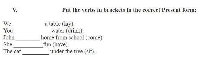 We lay a table, you Drink water, Jonh come Home from school, she have a fun, the cat sit under the tree