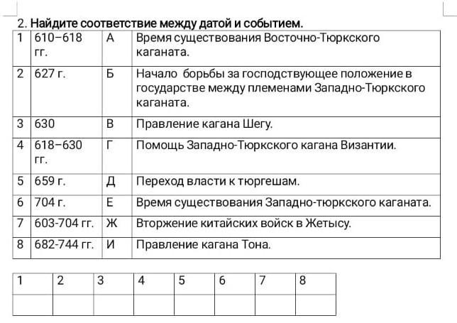 2. Найдите соответствие между датой и событием. 1 610-618 гг. 2 627 r. A Время существования Восточно-Тюркского каганата. Б Начало борьбы за господствующее положение в государстве между племенами Западно-Тюркского каганата. В Правление кагана Шегу. Г Помощь Западно-Тюркского кагана Византии. 3 630 4 618-630 гг. 5 659 r. Д Переход власти к тюргешам. 6 704 r. E 7 Время существования Западно-тюркского каганата. 603-704 гг. Ж Вторжение китайских войск в Жетысу. | 682-744 гг. И Правление кагана Тона. 8