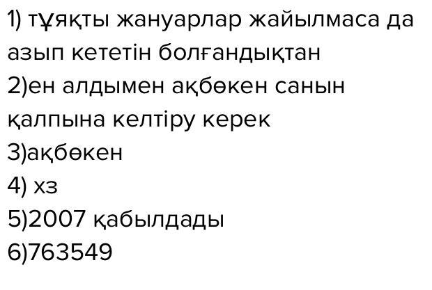 3-тапсырма. Сұрақтарға жауап беріңіздер. 1. «Бетпакдала>> деп кандай жердi атаган? 2. Осындай ұлан-байтак жердi сактап калу ушiн кандай шара ойластырылган? 3. Казак халкы ушiн кандай жануар киелі болып саналады? 4. Казак халкы акбекендi тагы калай атаган? 5. КР-нын Укiметi акбекендерді коргау максатында кандай шешімге келдi? Оны кашан кабылдады? 6. Канша гектар жердi ерекше корғалатын табиғи аумакка белдi?
