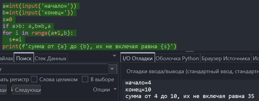 print(f'сумма от {a} до {b}, их не включая равна {s}')