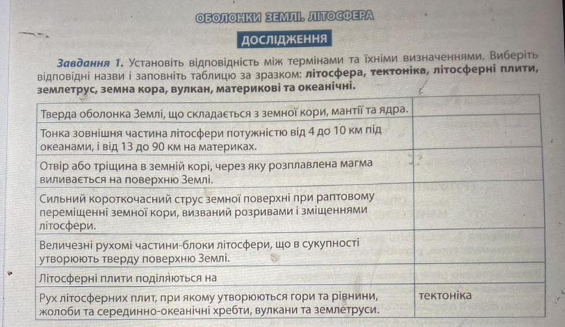 1 літосфера 2 землетрус 3 вулкан 4 океанізм 5 літосферні пліти 6 земна кора