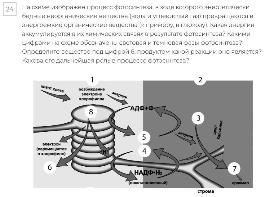 На схеме изображен процесс фотосинтеза, в ходе которого энергетически бедные неорганические вещества (вода и углекислый газ) превращаются в энергоемкие органические вещества (к примеру, в глюкозу). Какая энергия аккумулируется в их химических связях в результате фотосинтеза? Какими цифрами на схеме обозначены световая и темновая фазы фотосинтеза? Определите вещество под цифрой 6, продуктом какой реакции оно является? Какова его дальнейшая роль в процессе фотосинтеза?