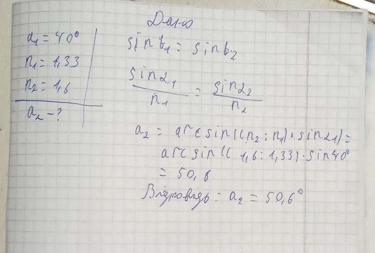 a2 = arcsin ((n2/n1)*sina1 )= arcsin((1,6/1,33)sin40)=50,6