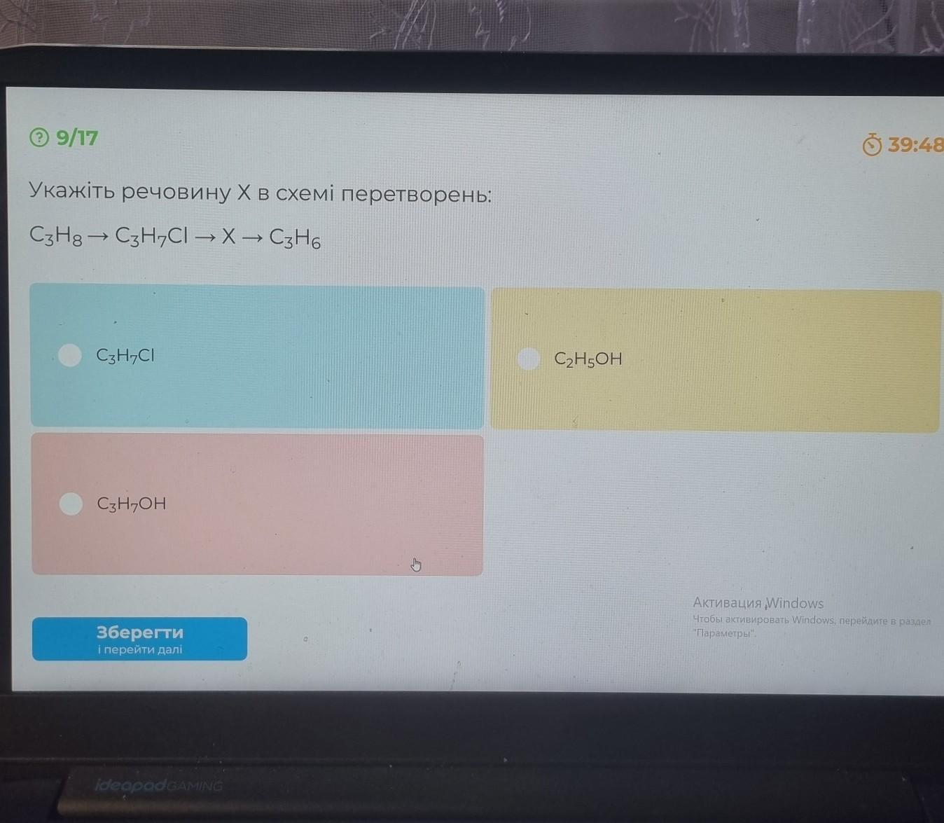 Укажіть речовину Х в схемі перетворень: C3H8 → C3H7CI → X→ C3H6 C3H₂CI C3H₂OH C₂H5OH