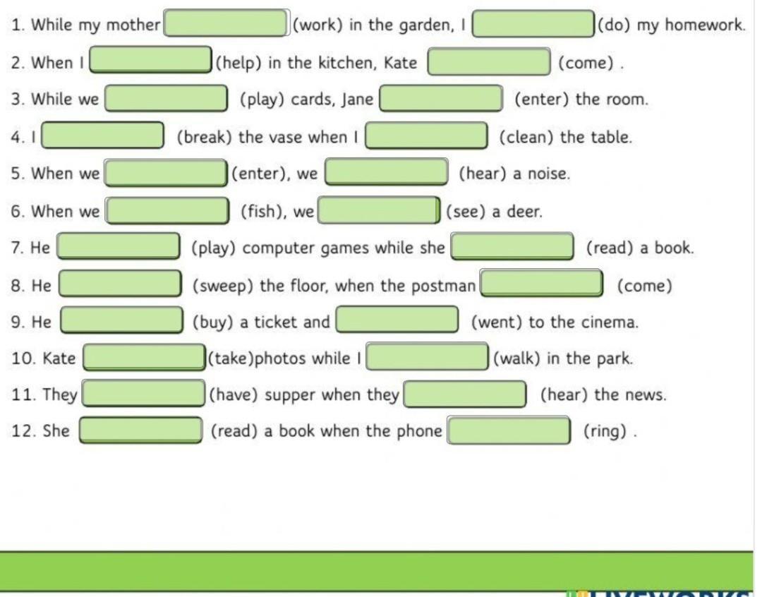 5. When the postman entered the room, we were cleaning the table. 6. He heard a noise while he was taking photos.