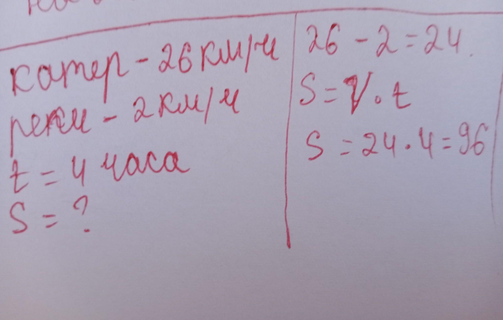 Власна швидкість катера дорівнює 26 км/год, а швидкість течії річки 2 км/год. Знайти відстань, яку подолає катер за 4 год, рухаючись проти течії річки.
