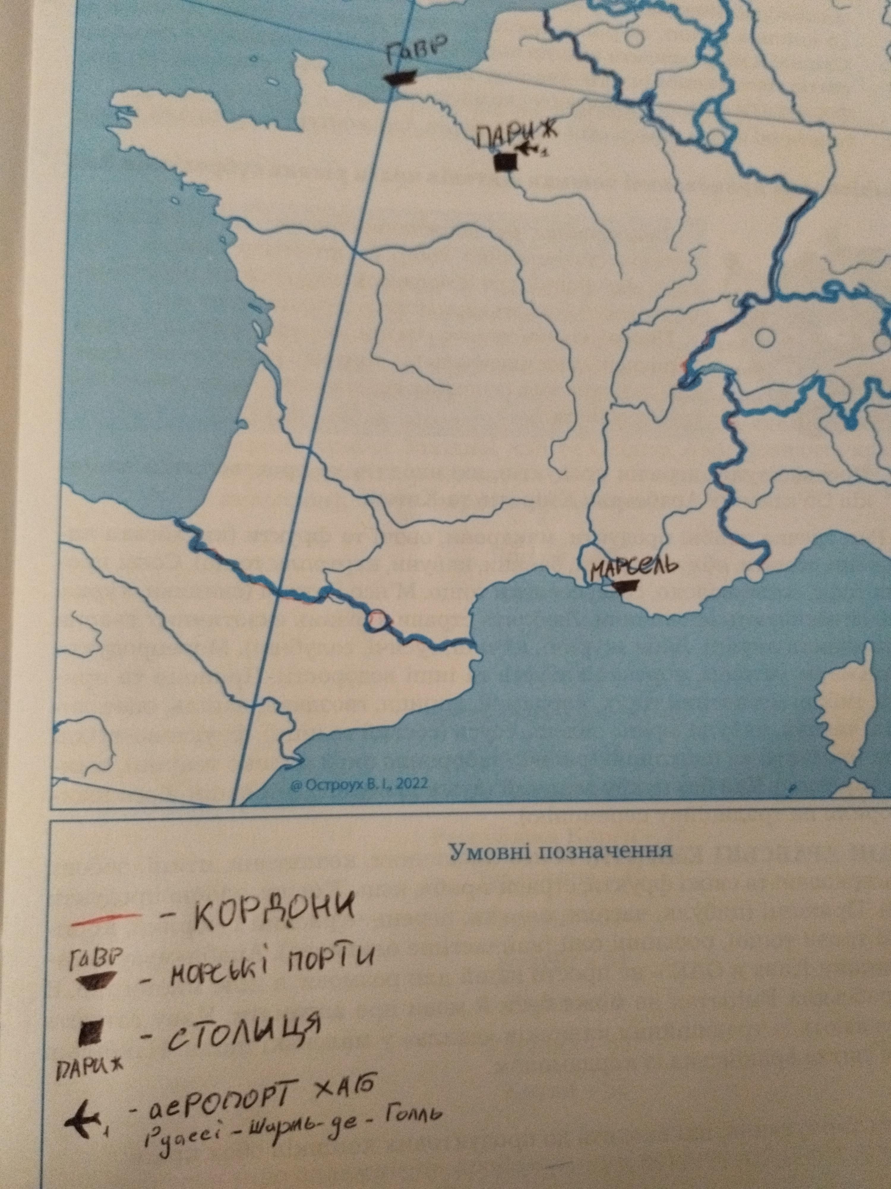 Позначте на картосхемі Франції (оберіть умовні позначення): а) найбільші морські порти - Марсель, Гавр; кер б) аеропорт-хаб - Руассі-Шарль-де-Голль; в) найбільший фінансовий центр – Париж; г) світове місто - Париж.