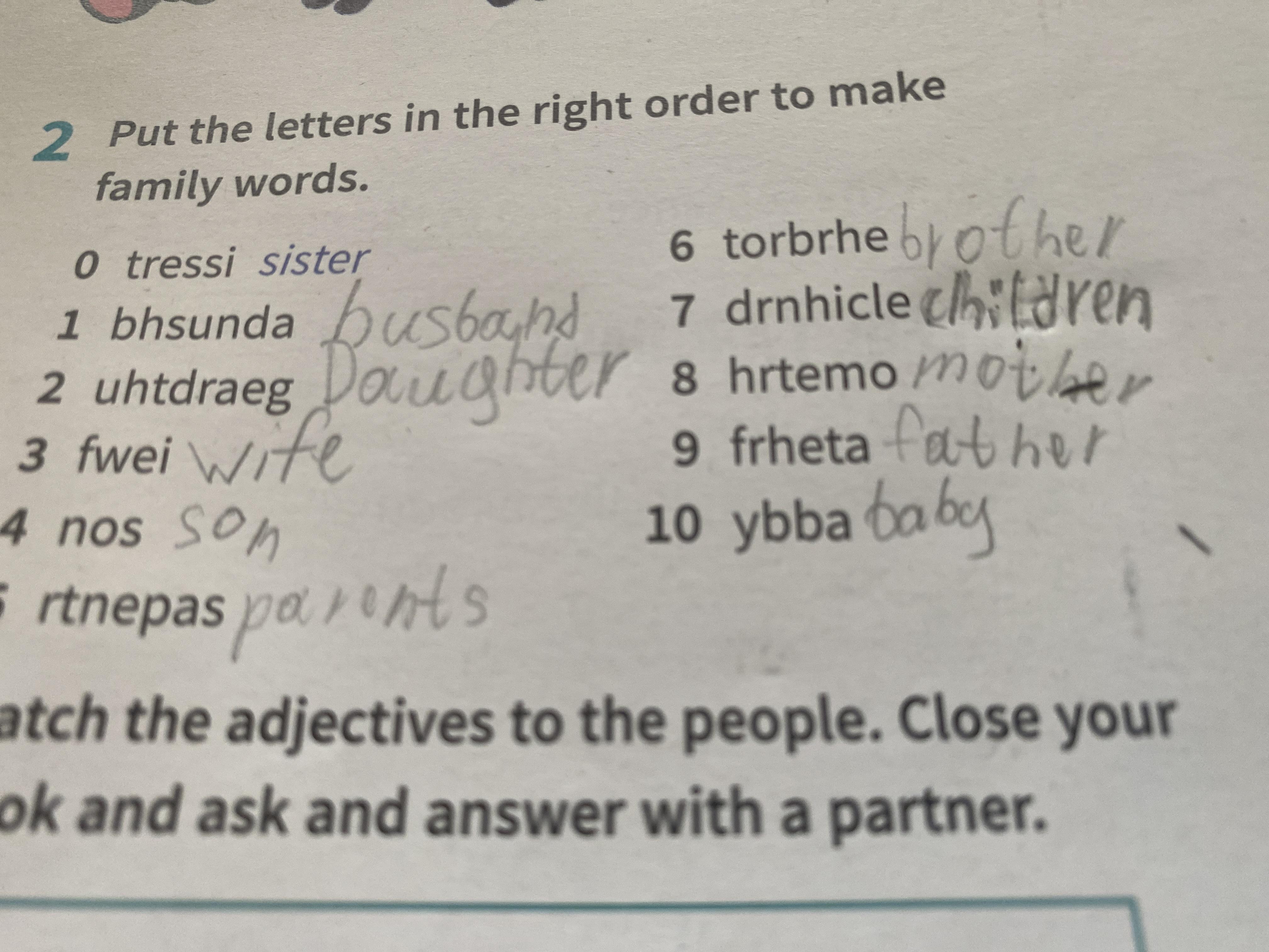 Ответ:1 husband 2 daughter 3 wife 4 son 5 parents 6 brother 7 children 8 mother 9 father 10 baby