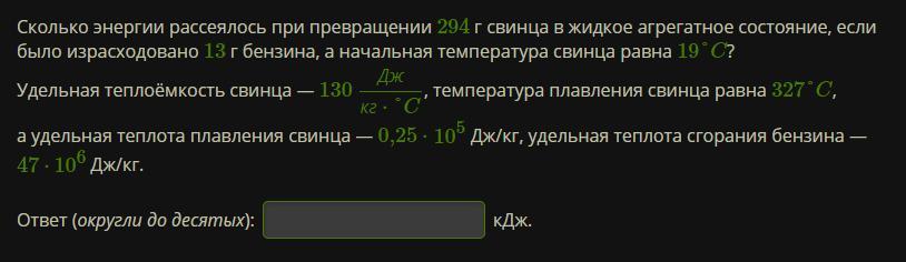 Удельная теплоёмкость свинца — 130 Джкг⋅°С, температура плавления свинца равна 327 °С, а удельная теплота плавления свинца — 0,25⋅10^5 Дж/кг, удельная теплота сгорания бензина — 47⋅10^6 Дж/кг.