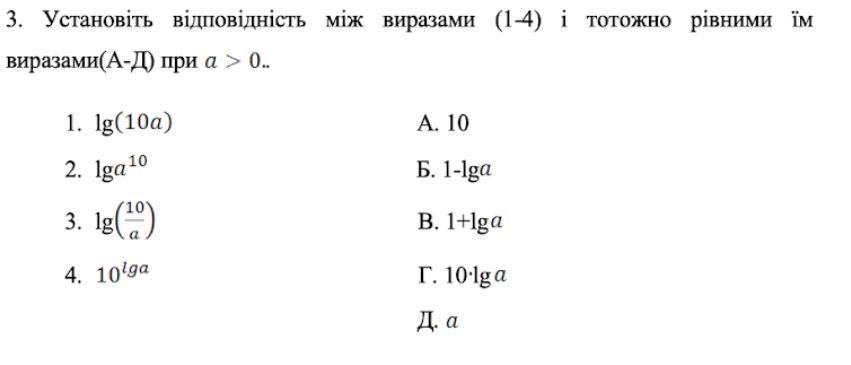 установіть відповідність між виразами (1-4) і тотожно рівними їм виразами (а-д) при a > 0