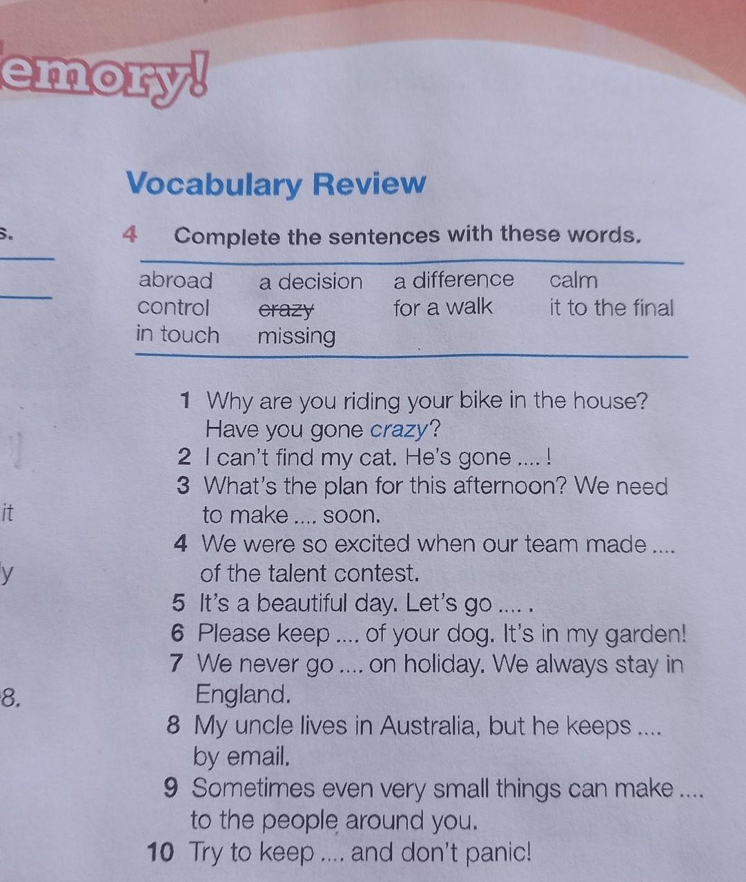 1 Why are you riding your bike in the house? Have you gone crazy? 2 I can't find my cat. He's gone....! 3 What's the plan for this afternoon? We need to make.... soon. 4 We were so excited when our team made.... of the talent contest. 5 It's a beautiful day. Let's go..... 6 Please keep.... of your dog. It's in my garden! 7 We never go.... on holiday. We always stay in England. 8 My uncle lives in Australia, but he keeps..... by email. 9 Sometimes even very small things can make .... to the people around you. 10 Try to keep.... and don't panic!