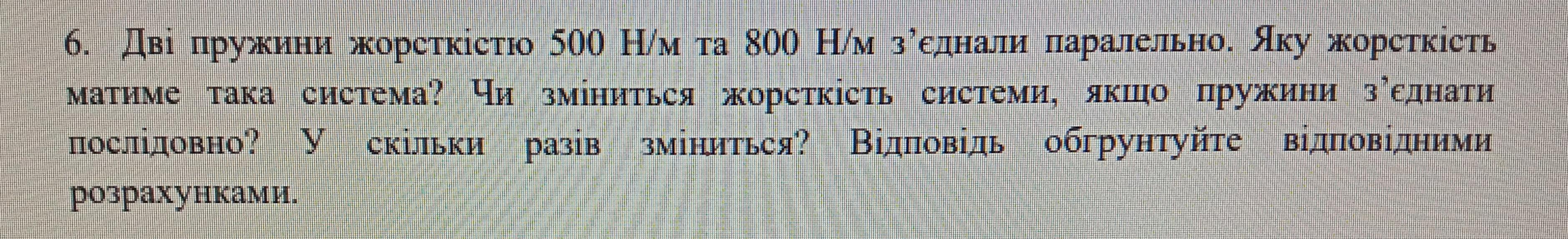 паралельно: k= 500H/м + 800Н/м = 1300 Н/м. Послідовно: k= 500*800/500+800 = 307,69 H/м .
