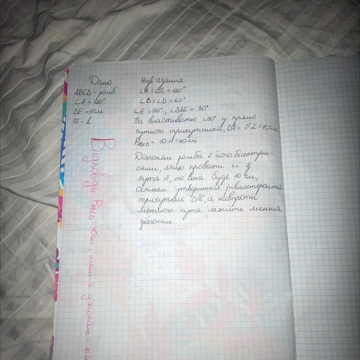 СРОЧНО Тупий кут ромба А дорівнює 120°. З вершини цього кута проведено висоту, яка відтинає від сторони відрізок ДЕ = 5 см. Знайдіть периметр ромба і довжину меншої з діагоналей.