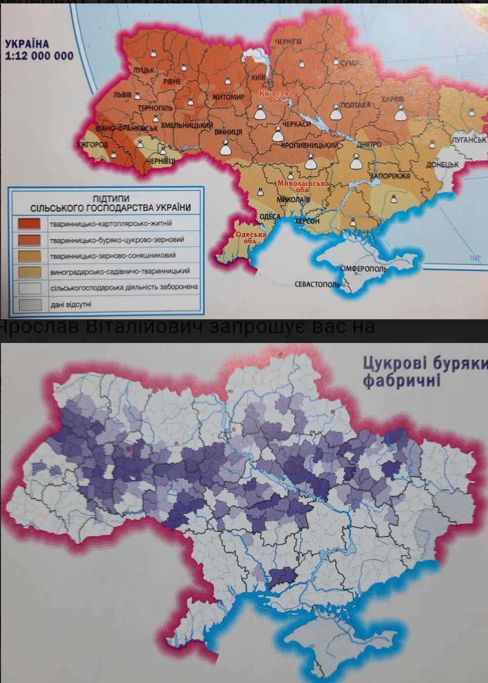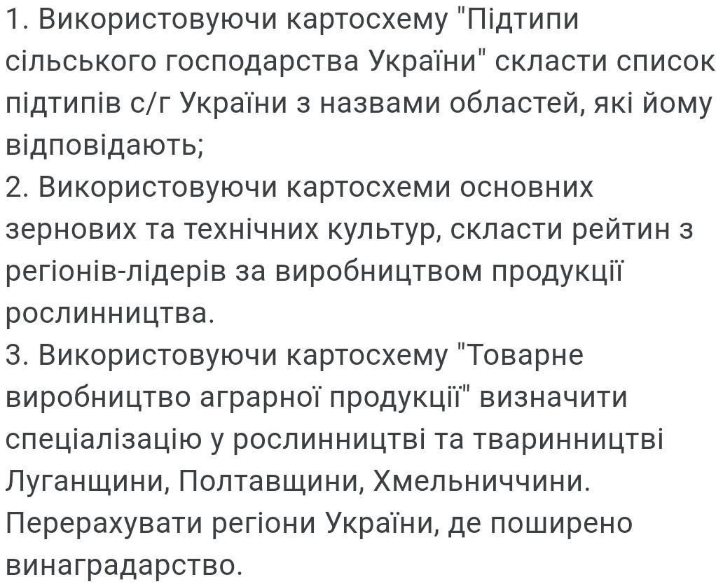1. Використовуючи картосхему "Підтипи сільського господарства України" скласти список підтипів с/г України з назвами областей, які йому відповідають;