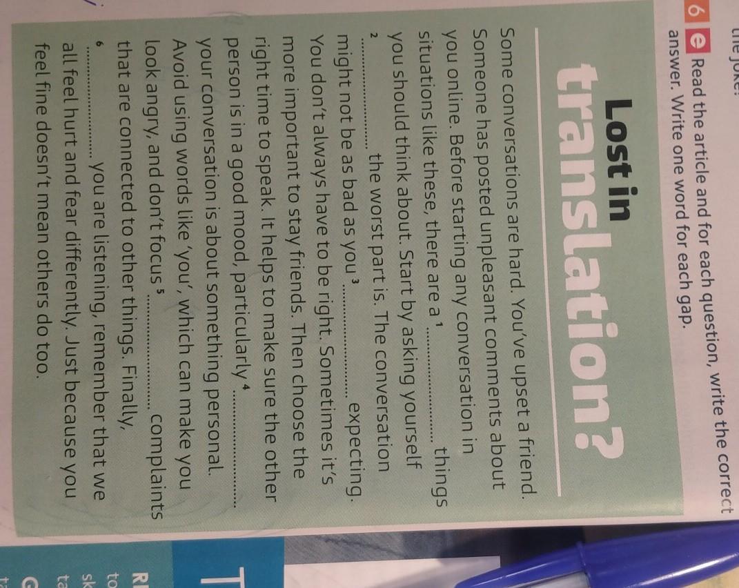 Read the article and for each question, write the corred answer. Write one word for each gap. Lost in translation? Some conversations are hard. You've upset a friend. Someone has posted unpleasant comments about you online. Before starting any conversation in situations like these, there are a ¹ things you should think about. Start by asking yourself the worst part is. The conversation might not be as bad as you expecting. You don't always have to be right. Sometimes it's more important to stay friends. Then choose the right time to speak. It helps to make sure the other person is in a good mood, particularly .…....... your conversation is about something personal. Avoid using words like 'you', which can make you look angry, and don't focus................ complaints that are connected to other things. Finally, you are listening, remember that we all feel hurt and fear differently. Just because you feel fine doesn't mean others do too.