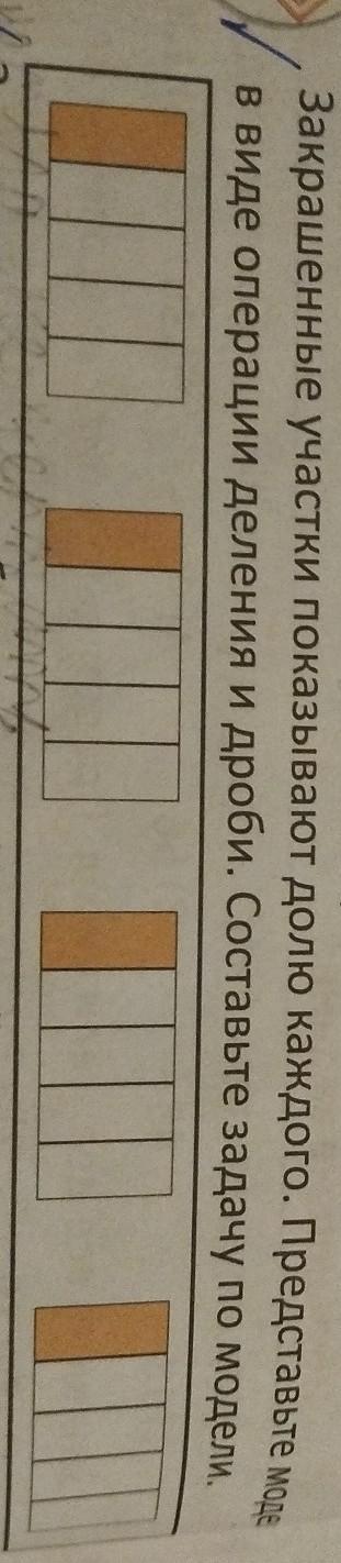 Закрашенные участки показывают долю каждо в виде операции деления и дроби. Составьте задачу по модели.
