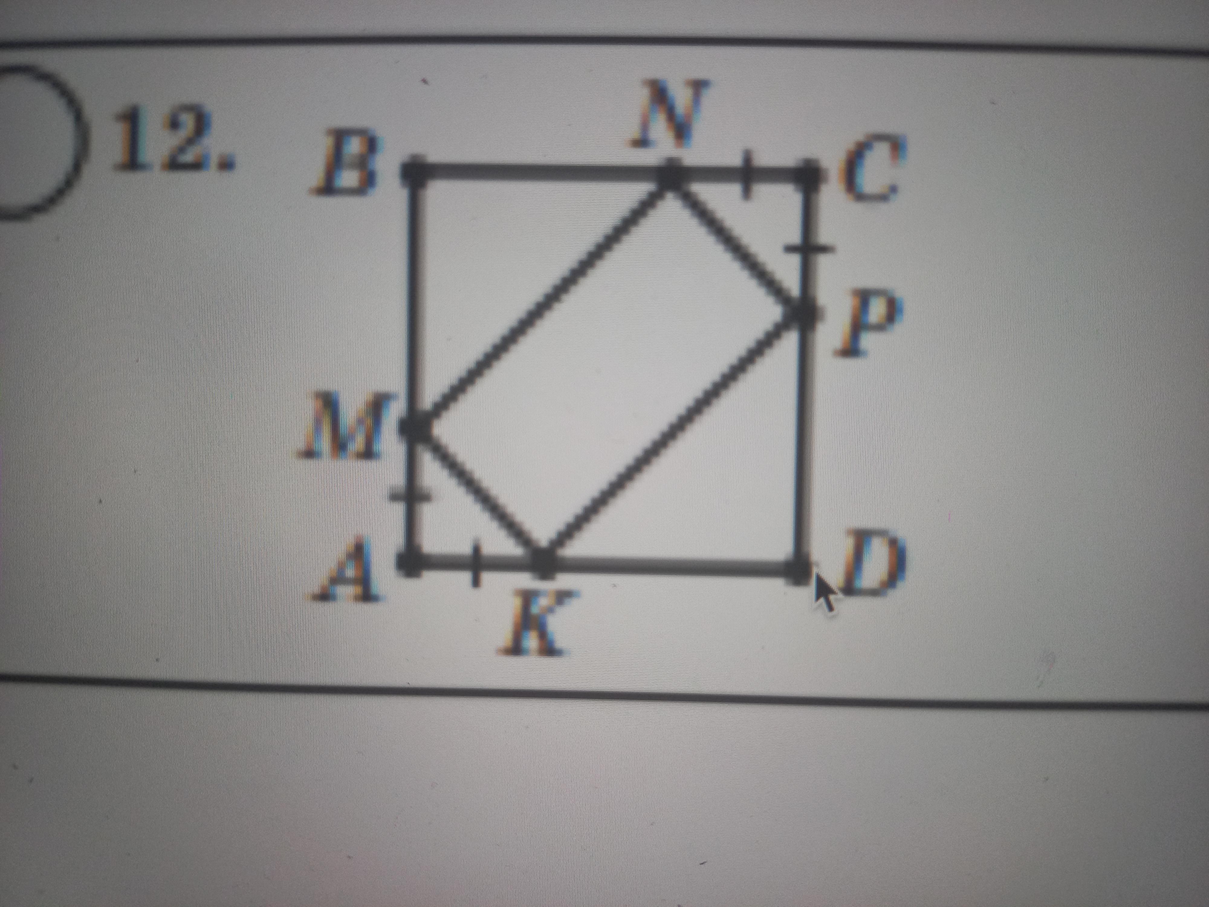 На сторонах квадрата ABCD поставлено точки М. N. Р. К так, як показано на рисунку. AM = AK = CN = CP Чотирикутник MNPK є