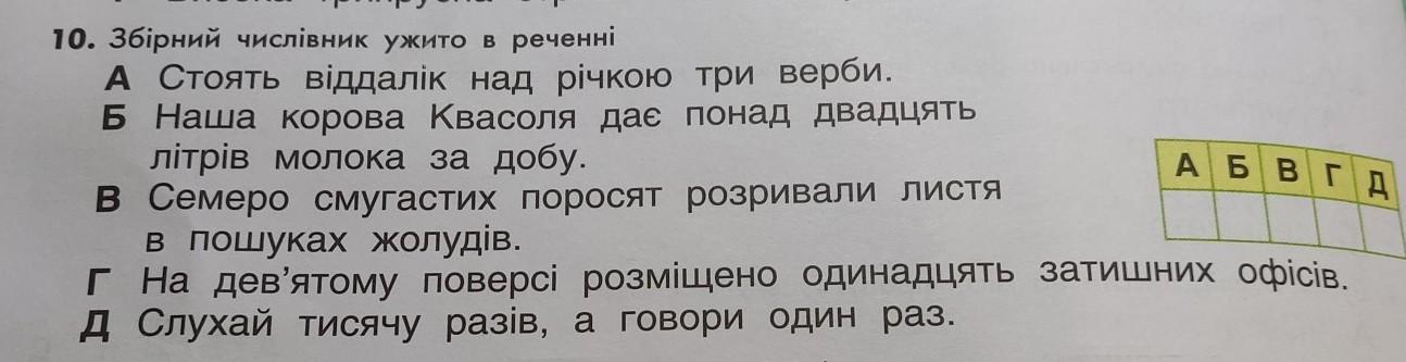 10. Збірний числівник ужито в реченні А Стоять вiддалік над річкою три верби. Б Наша корова Квасоля дає понад двадц в пошуках жолудів. г На дев'ятому поверсі розміщено одинадцять затишних офісів. Д Слухай тисячу разів, а говори один раз. літрів молока за добу. В Семеро смугастих поросят розривали листя