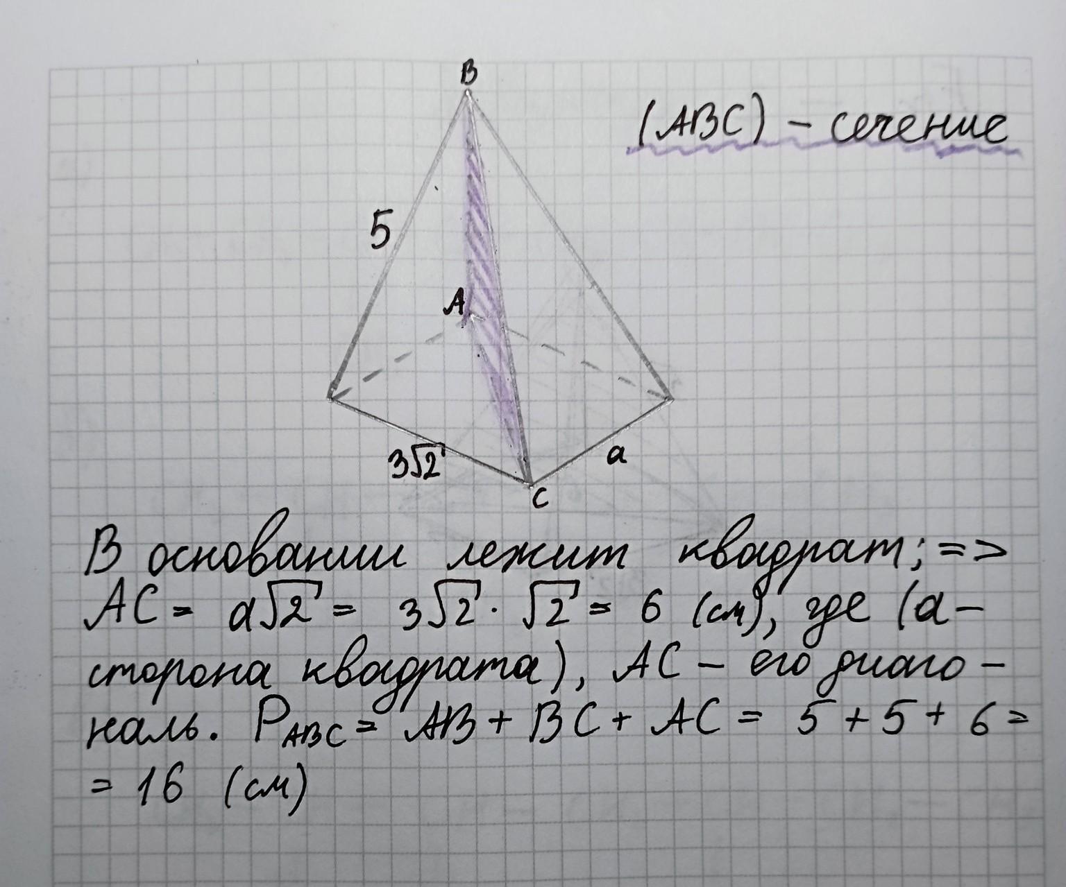Знайти периметр діагонального перерізу правильної чотирикутної піраміди, сторона основи якої дорівнює 3v2 см, а бічне ребро - 5 см.