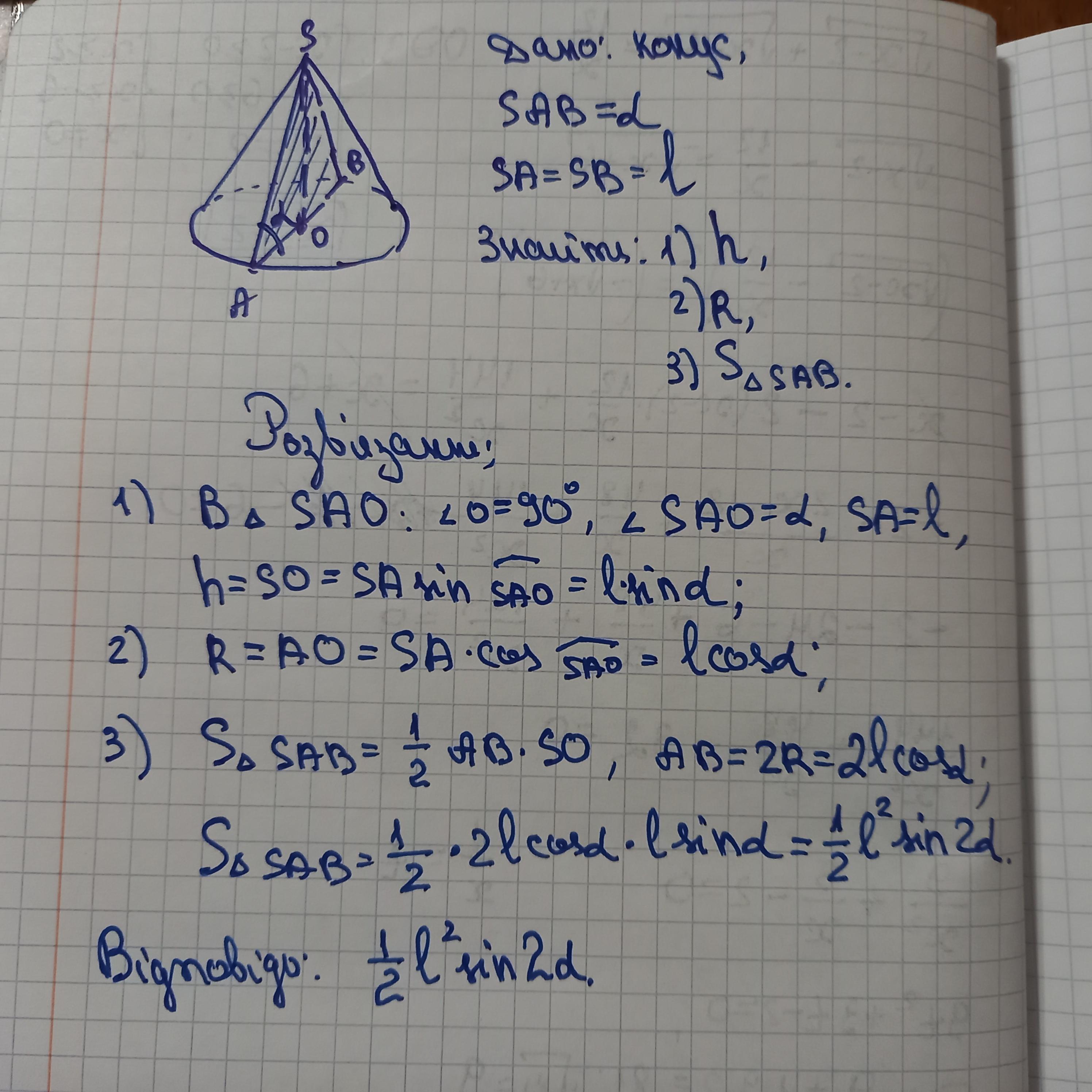Твірна конуса дорівнює l і нахилена до площини основи під кутом а.Знайдіть:а)висоту конуса б)радіус основи в)площу осьового перерізу?