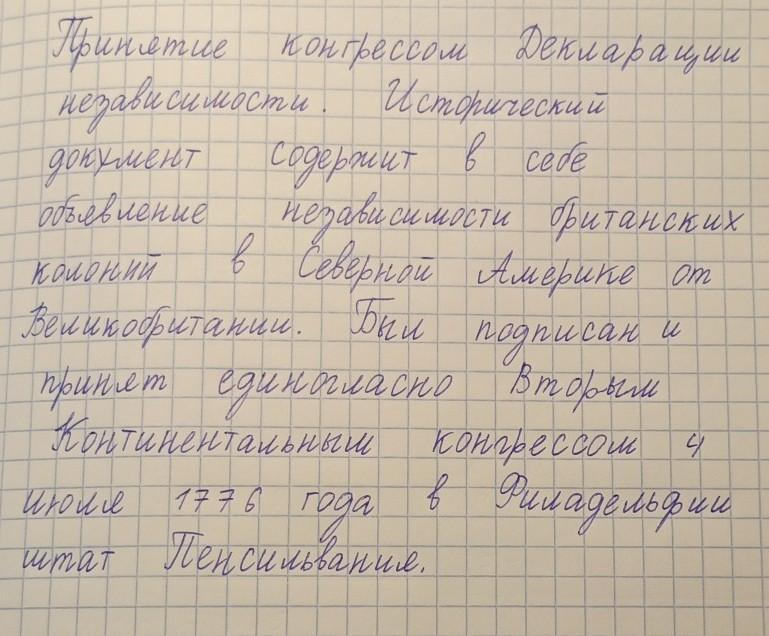 Принятие конгрессом Декларации независимости. Исторический документ содержит в себе объявление независимости британских колоний в Северной Америке от Великобритании. Был подписан и принят единогласно Вторым Континентальным конгрессом 4 июля 1776 года в Филадельфии штат Пенсильвания.