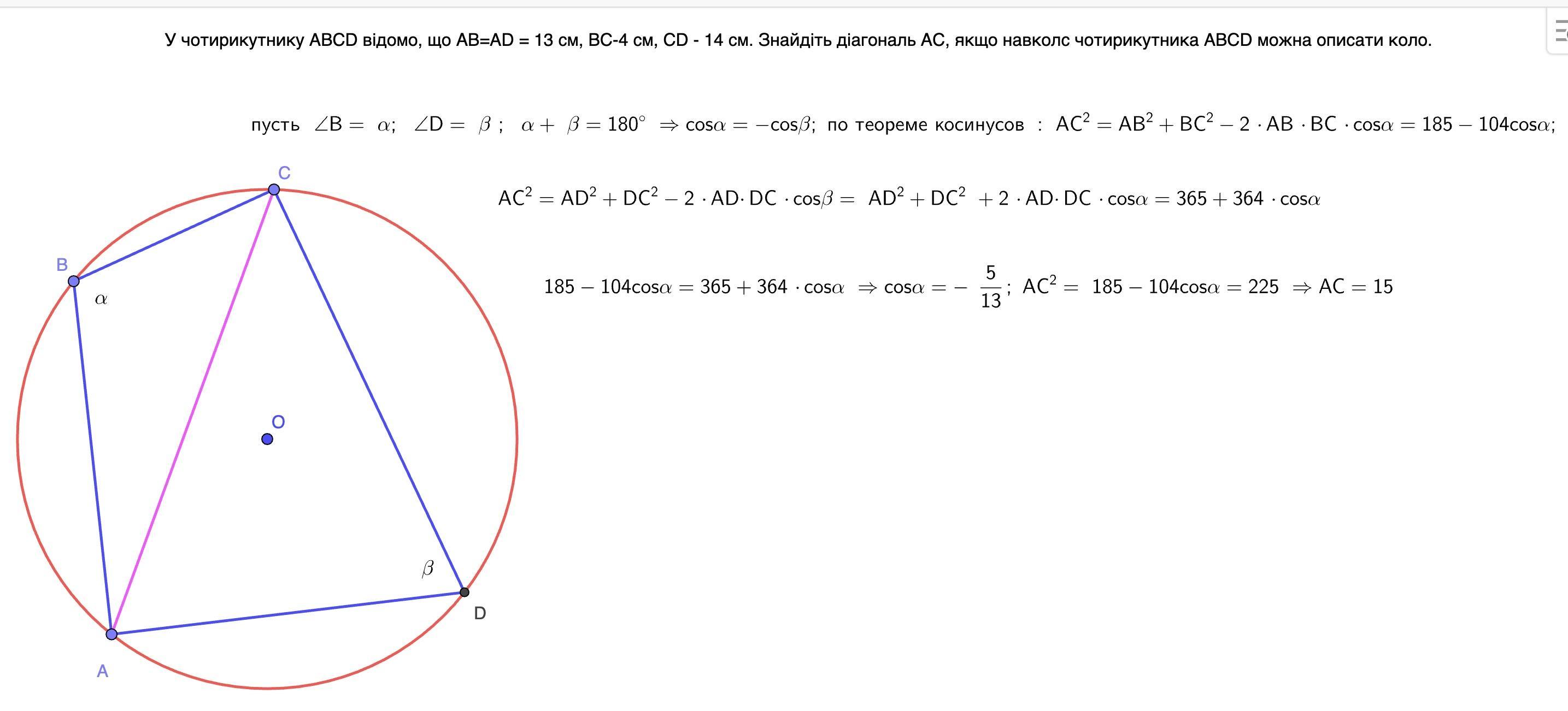 У чотирикутнику ABCD відомо, що АВ=AD = 13 см, ВС-4 см, CD - 14 см. Знайдіть діагональ АС, якщо навколс чотирикутника ABCD можна описати коло.
