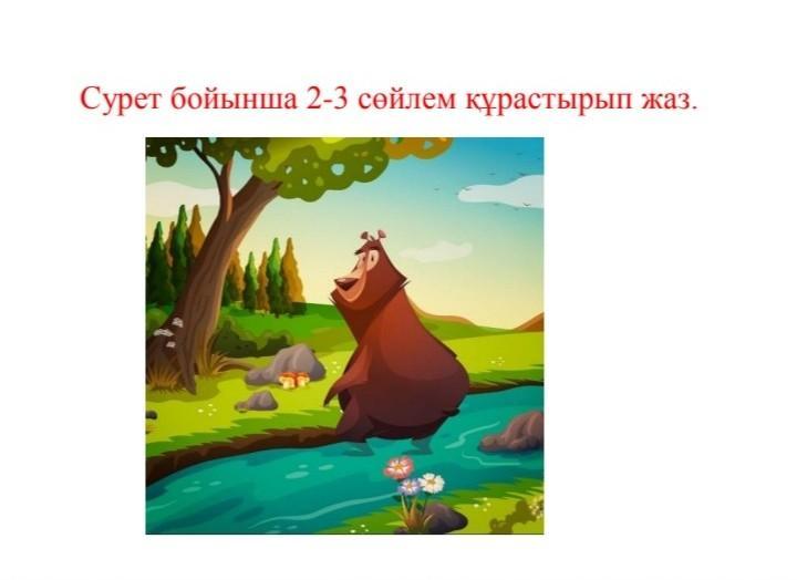 суретте табиғат бейнеленген.суда серуендеп жүрген аю бар.суретте көптеген өсімдіктер бар.Артқы жағында шыршалар мен ағаштар бар.