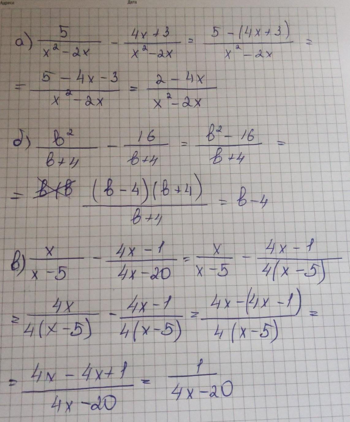 3. Виконай віднімання дробів. 5 4x+3 x² - 2x x²-2x a) ; б) b2 b+4 16 6+4 B) x x-5 4x-1 4x-2