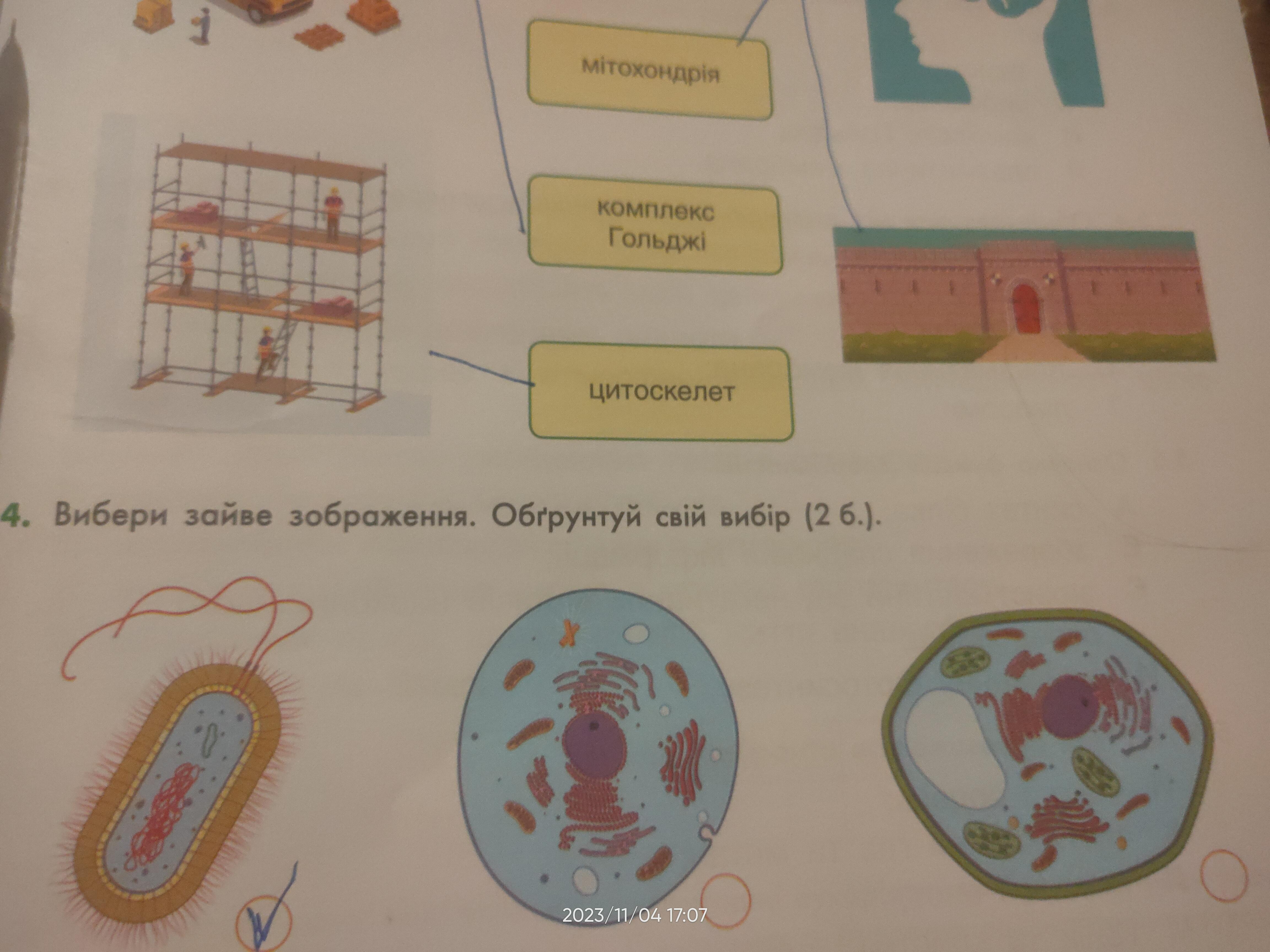 а що пояснити треба? На 4.зайва 1 ,тому що це бактеріальна клітина(прокаріот-немає ядра),2 і 3-рослина і тварина клітини(єукаріоти)мають ядра
