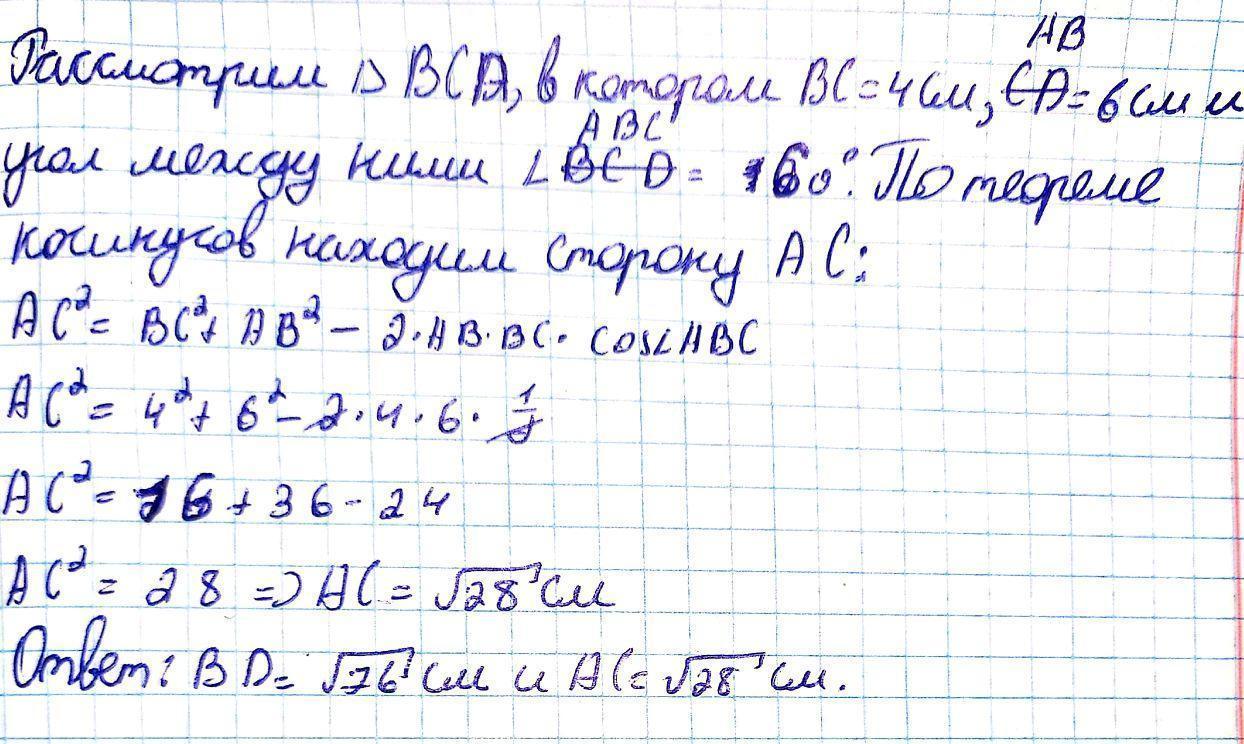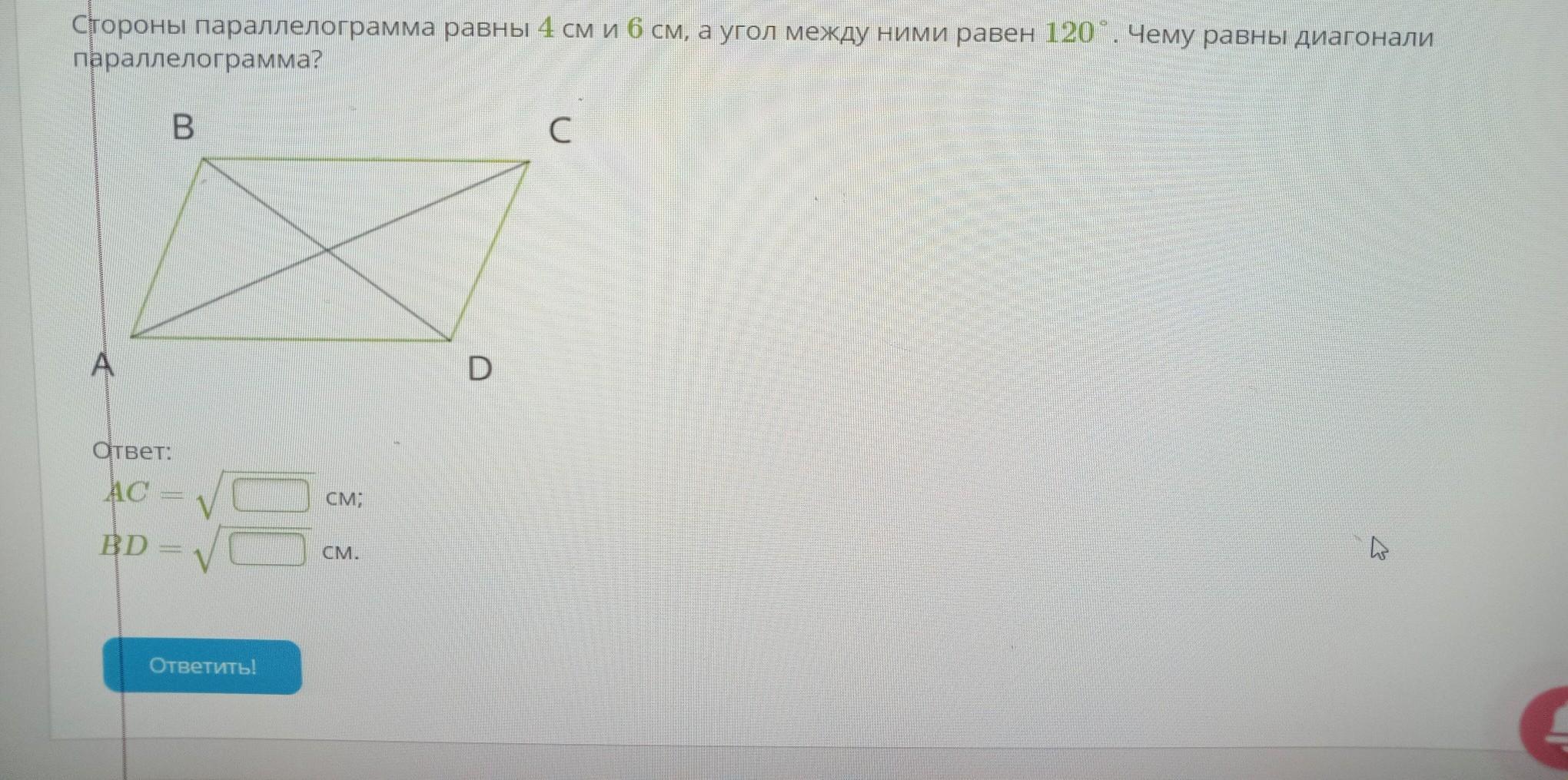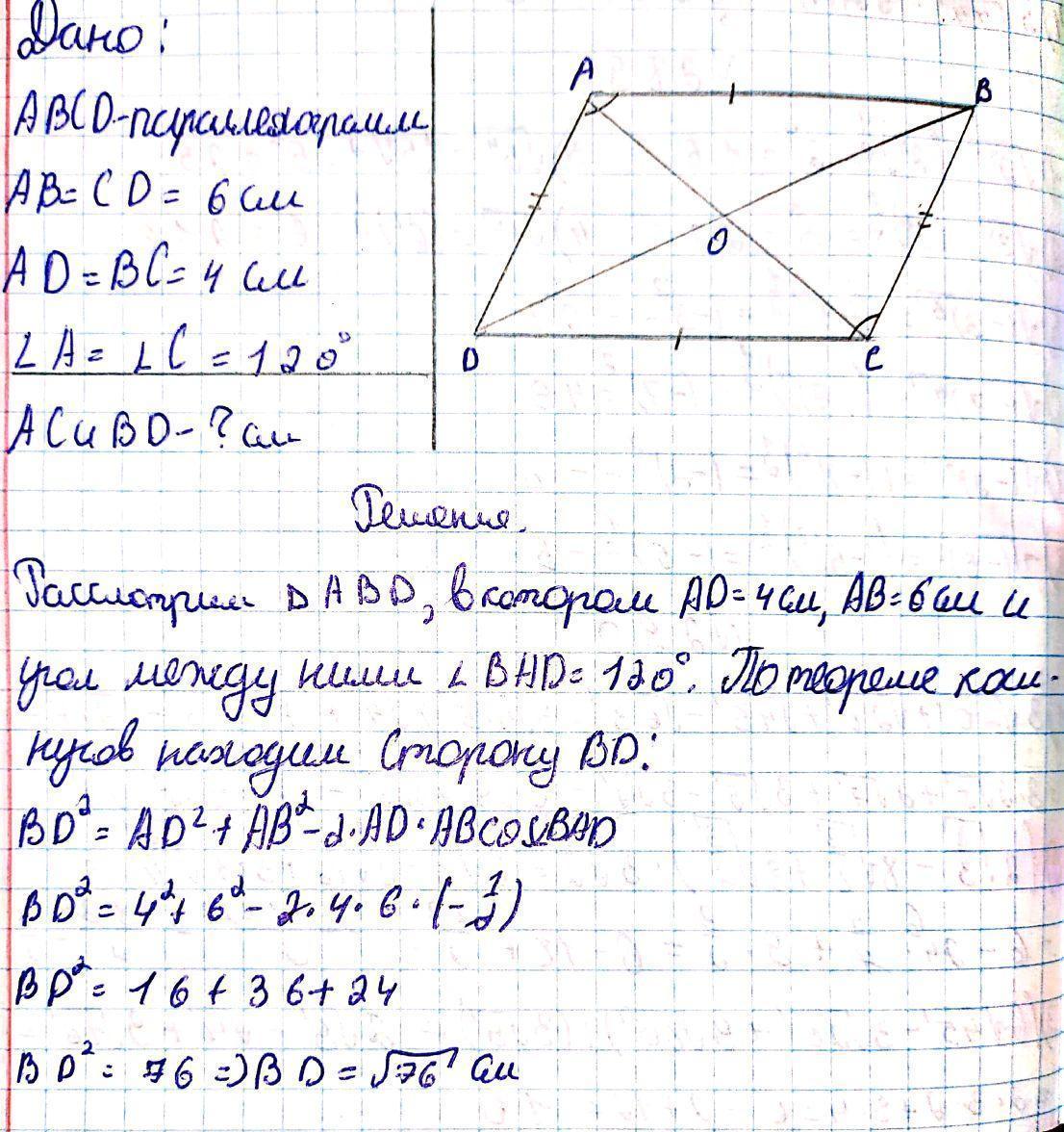 стороны параллелограмма равны 4 см и 6 см, а угол между ними равен 120°. Чему равны диагонали параллелограмма? В A Ответ: AC = BD = = З см; CM. D C В
