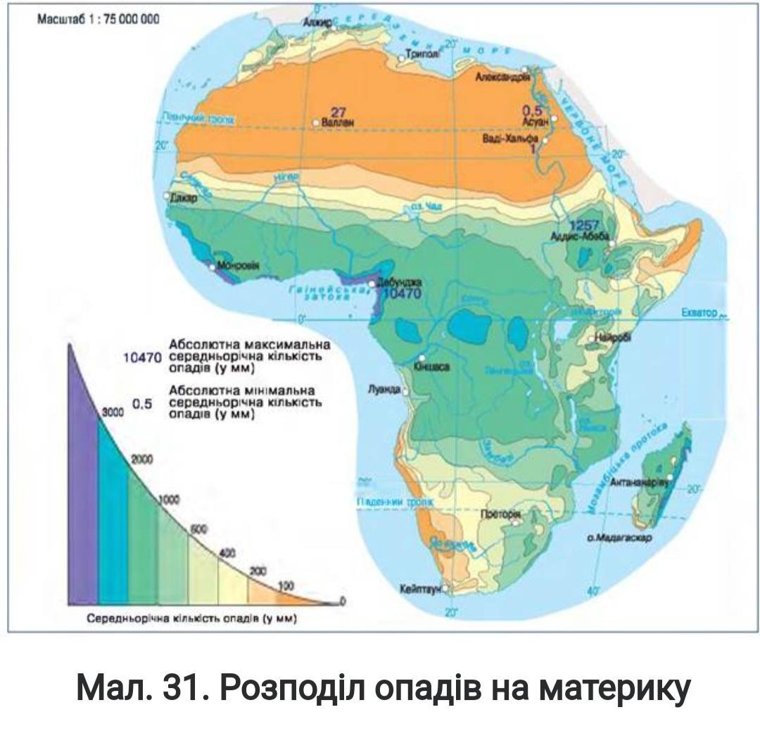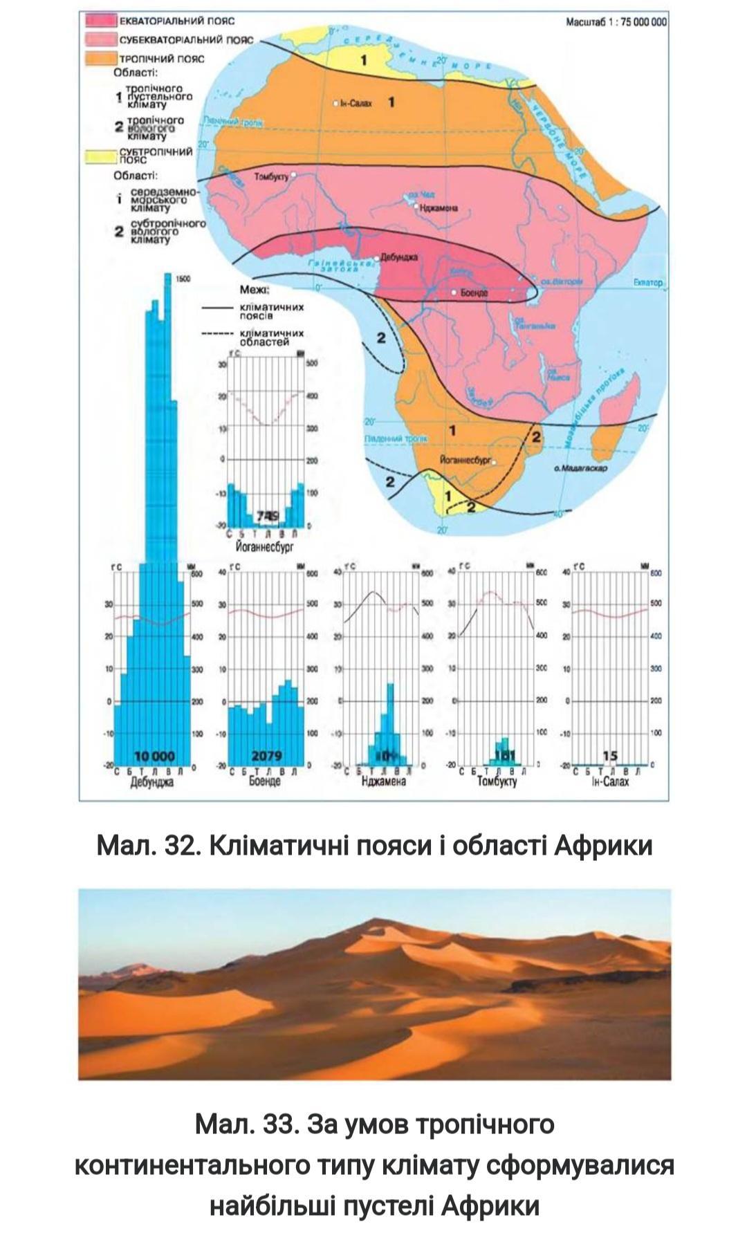 МОЇ ДОСЛІДЖЕННЯ На основі аналізу картосхем (мал. 30, 31, 32) з'ясуйте особли- вості клімату двох населених пунктів Африки (на власний вибір) i заповніть у зошиті таблицю. (Порівняння робіть за такими показ- никами: переважаючі повітряні маси, середня температура повітря липня і січня, річна амплітуда коливання температури повітря, яка рiчна кількість опадів і коли вони випадають, назва кліматич- ного поясу і типу клімату.)