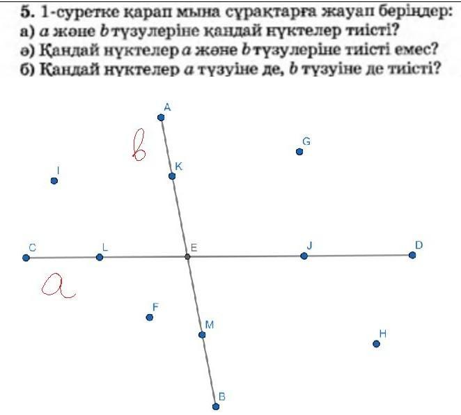 Прямой a принадлежат точки C, L, E, J, D. Прямой b принадлежат точки A, K, E, M, B.