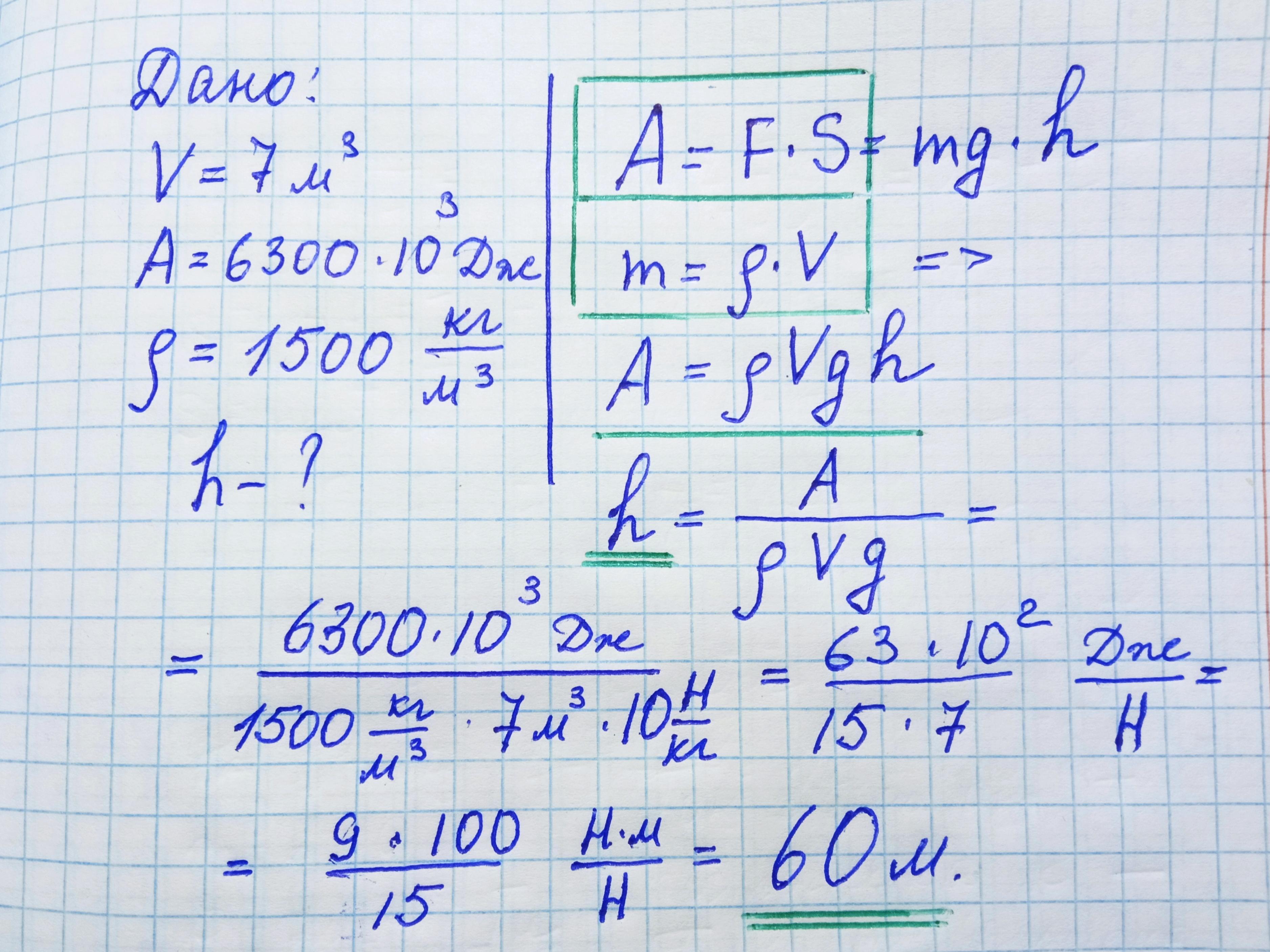 для поднятия из шахты угля объемом 7 м³ двигатель крана выполнил работу 6300 кДж. Определи глубину шахты, если известно, что плотность угля 1500 кг/м³