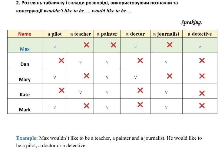 Mary wouldn`t like to be a teacher, a journalist and a detective. She would like to be a pilot, a painter or a doctor.