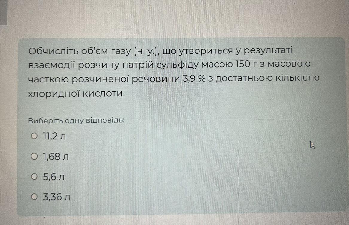 5) V(H2S) = n(H2S) * Vm = 0,075 * 22,4 = 1,68 л.