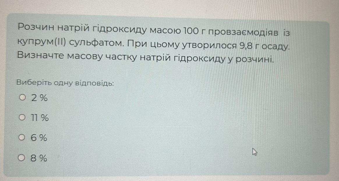 5) ω(NaOH) = m * 100% / m р-ну = 8 * 100% / 100 = 8%.