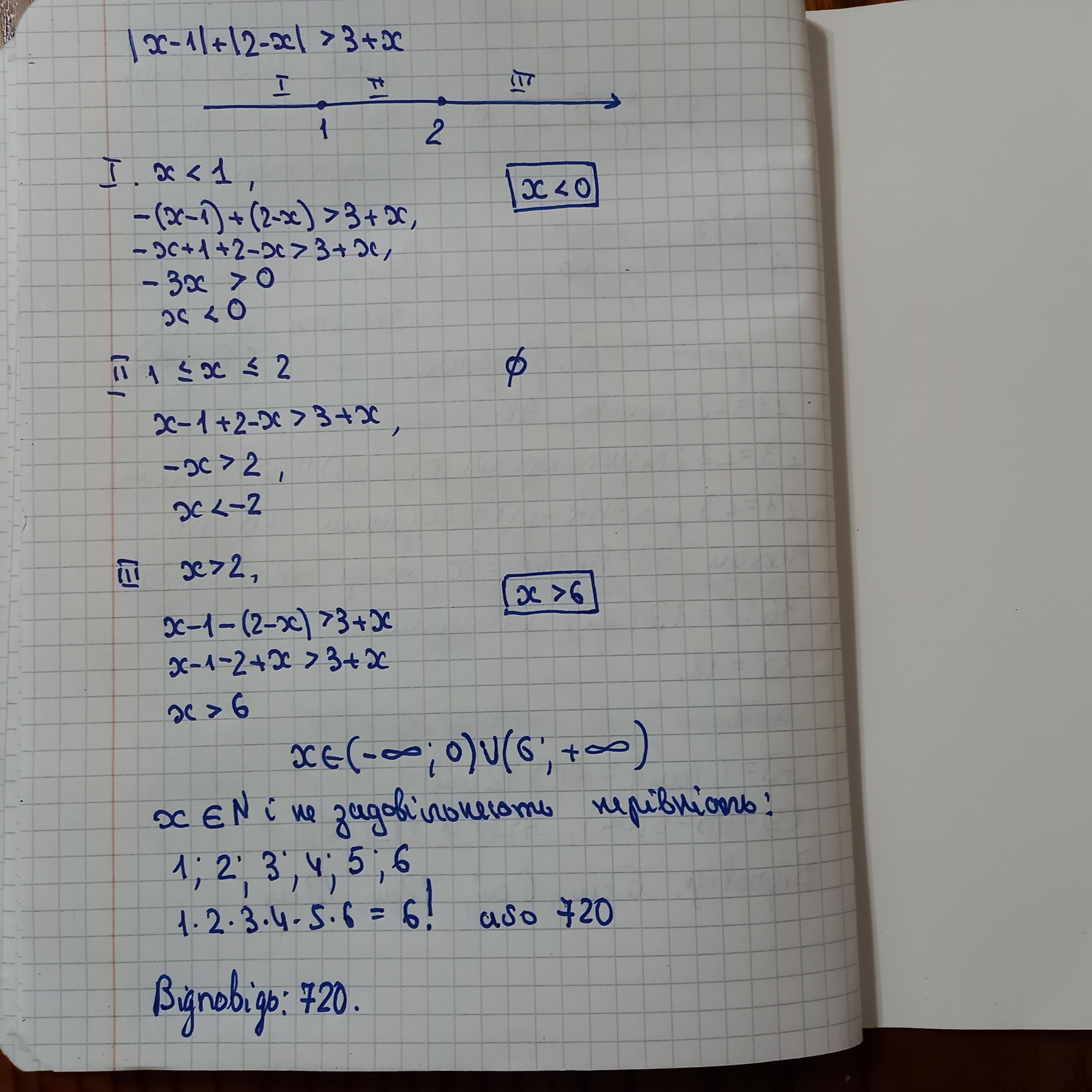 Знайди добуток усіх натуральних чисел, які не задовільняють нерівність |х-1|+|2-х|>3+х