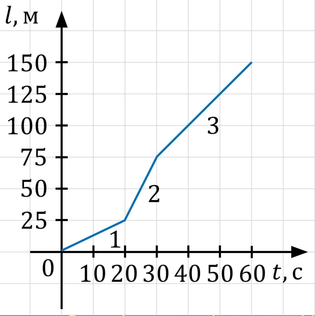 На графіку представлено залежність пройденого шляху l від часу t. Шлях, який проходить об'єкт, збільшується з часом. Поділимо рух на три етапи: