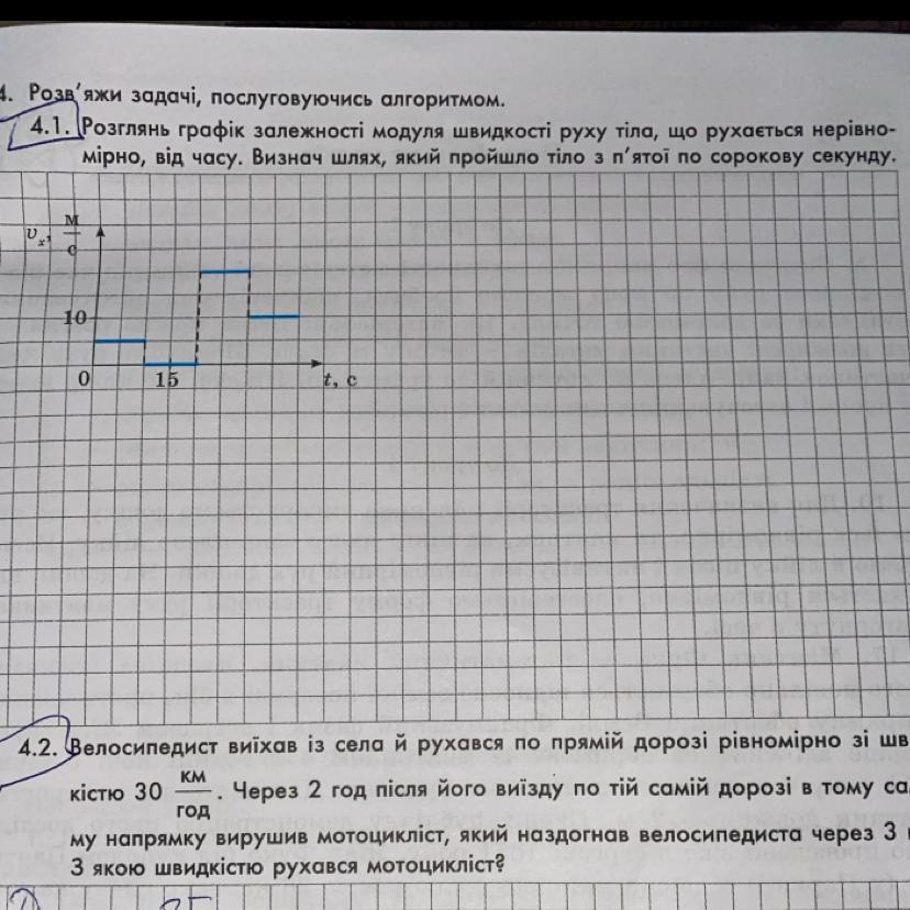 4.1. Розглянь графік залежності модуля швидкості руху тіла, що рухається нерiвно-