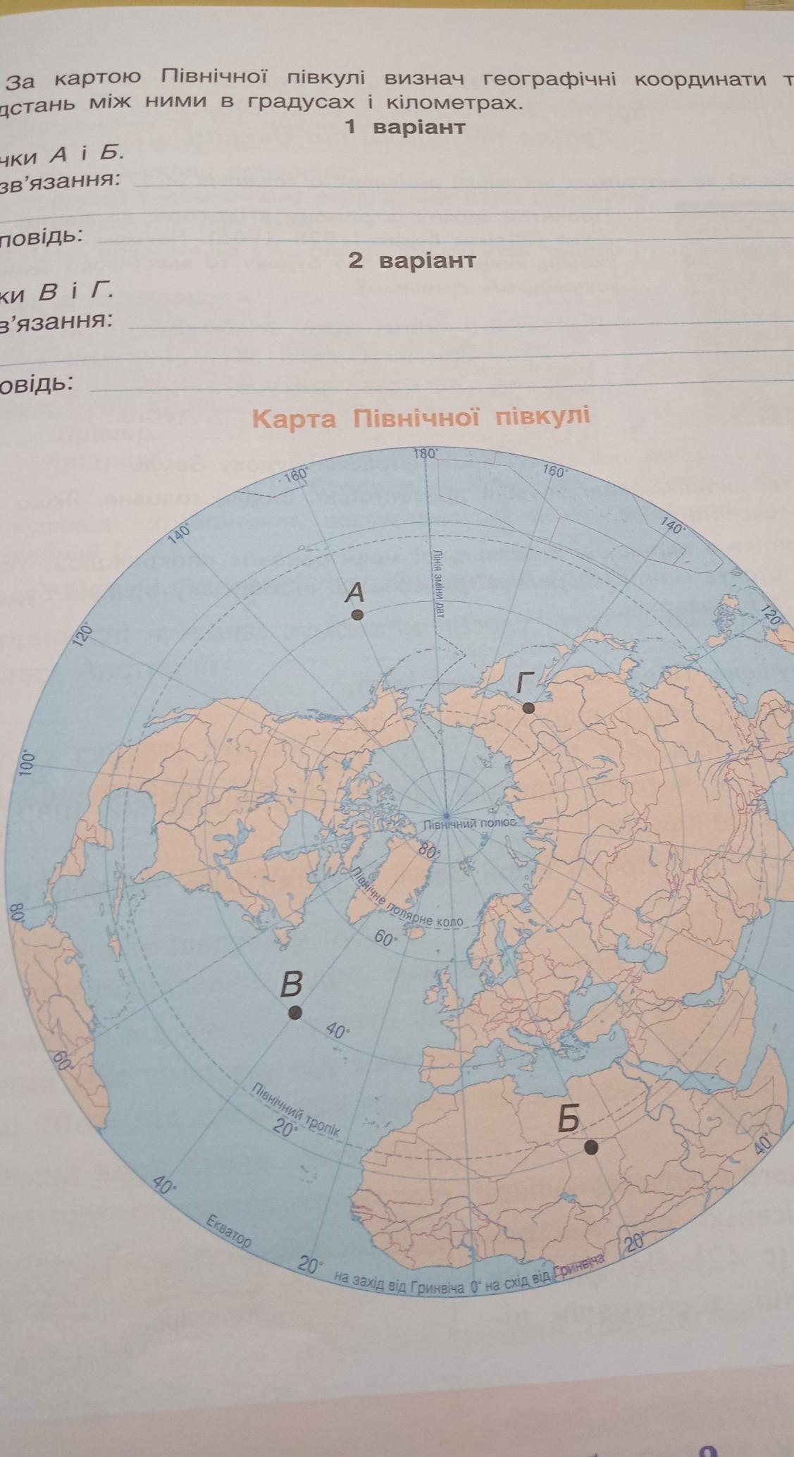 4. За картою Північної півкулі визнач географічні координати точок та відстань між ними в градусах і кілометрах.