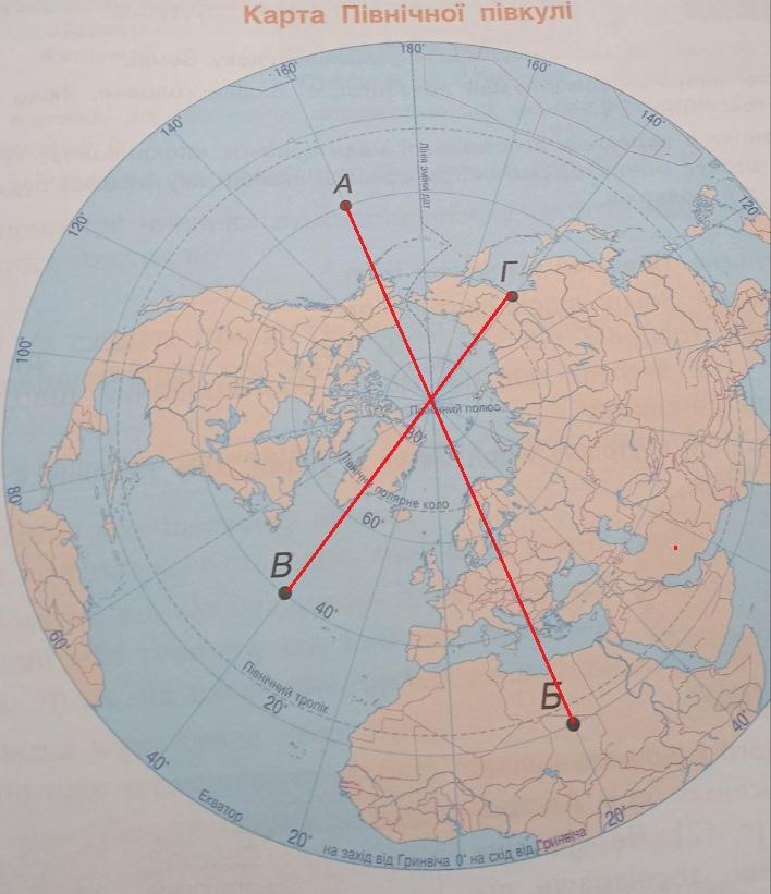 - За картою Північної півкулі визнач географічні координати точок та відстань між ними в градусах і кілометрах.