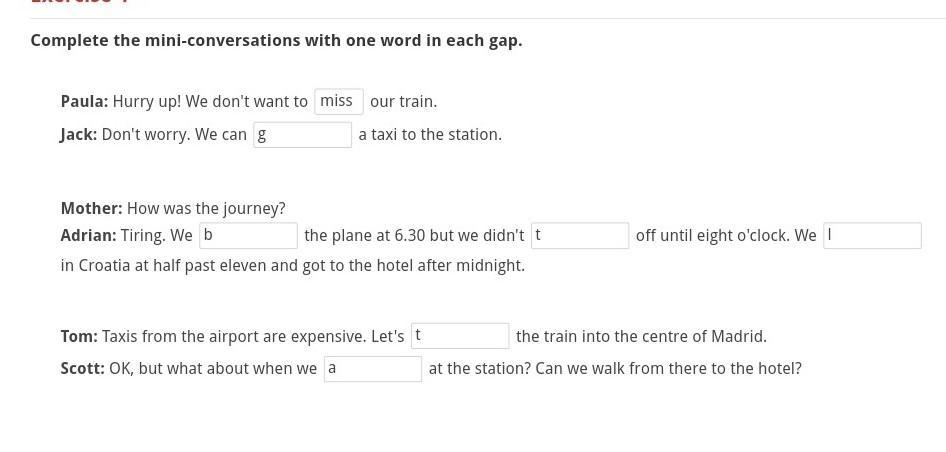 Exercise 4** Complete the mini-conversations with one word in each gap. Paula: Hurry up! We don't want to miss our train. Jack: Don't worry. We can g a taxi to the station. Mother: How was the journey? Adrian: Tring We D the plane at 6.30 but we didn't t in Croatia at half past eleven and got to the hotel after midnight. off until eight o'clock. We Tom: Taxis from the airport are expensive. Let's t the train into the centre of Madrid. Scott: OK, but what about when we a at the station? Can we walk from there to the hotel?