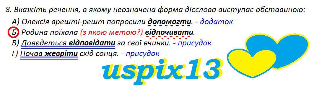 8. Вкажіть речення, в якому неозначена форма дієслова виступає обставиною: А) Олексія врешті-решт попросили допомогти. Б) Родина поїхала відпочивати. В) Доведеться відповідати за свої вчинки. Г) Почав жевріти схід сонця.