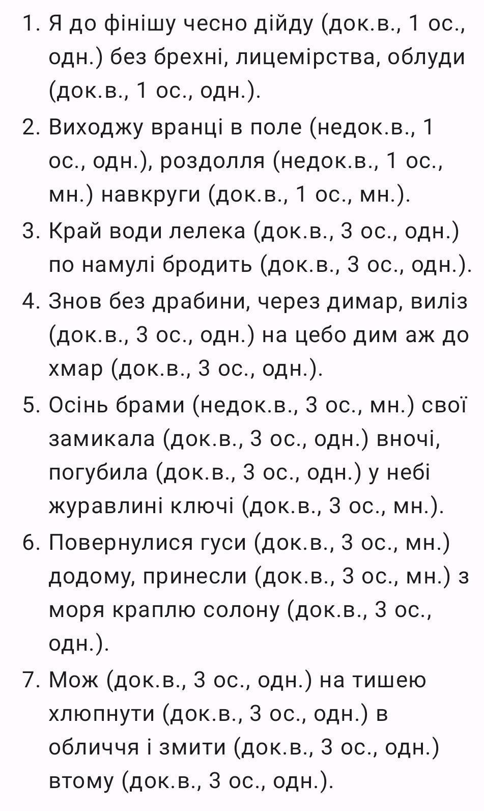 132 1. Спишіть речення. Після кожного дієслова запишіть у дужках його вид. особу й число. ЗРАЗОК Лапаті сніжинки вальсували (недок. в., 3 ос., мн.) у світлі вуличних ліхтарів (Н. Малетич). 1. Я до фінішу чесно дійду без брехні, лицемірства, облуди* (Л. Воловець). 2. Виходжу вранці в поле, роздолля** навкруги! (Л. Дмитерко). 3. Край води лелека по намулі бродить (М.Са мійленко). 4. Знов без драбини, через димар, виліз на цебо дим аж до хмар (А. Качан). 5. Осінь брами*** свої замикала вночі, погубила у небі журавлині ключі (Л. Костенко). 6. Повернулися гуси додому, принесли з моря краплю солону (Г. Чубач). 7. Мож на тишею хлюпнути в обличчя і змити втому (Є. Гуцало). Допоможить будласка швыдше у мене невыстачае балив