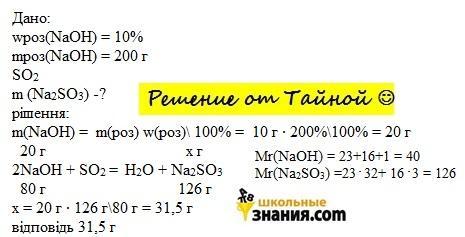 Крізь розчин масою 200г з масовою часткою натрій гідроксиду 10% пропустили сірчистий газ. Яка маса натрій сульфіту утворилася?