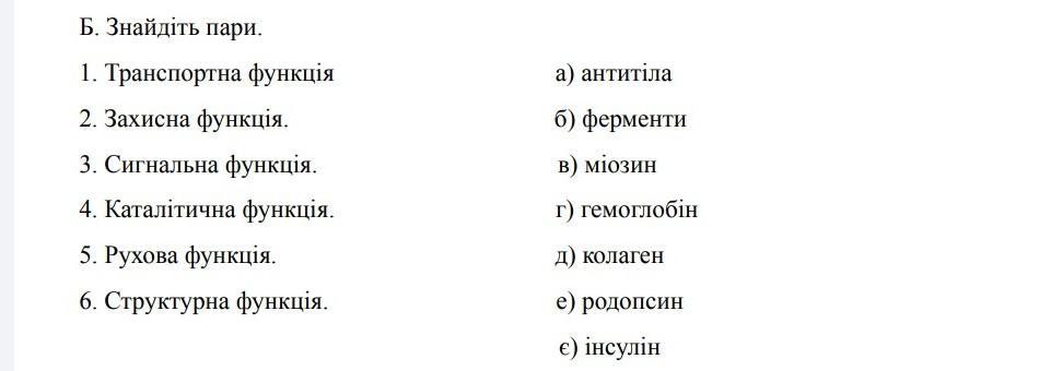Б. Знайдіть пари. 1. Транспортна функція 2. Захисна функція. 3. Сигнальна функція. 4. Каталітична функція. 5. Рухова функція. 6. Структурна функція. а) антитіла б) ферменти в) міозин г) гемоглобін д) колаген e) родопсин є) інсулін. срочно! дам 15 балів