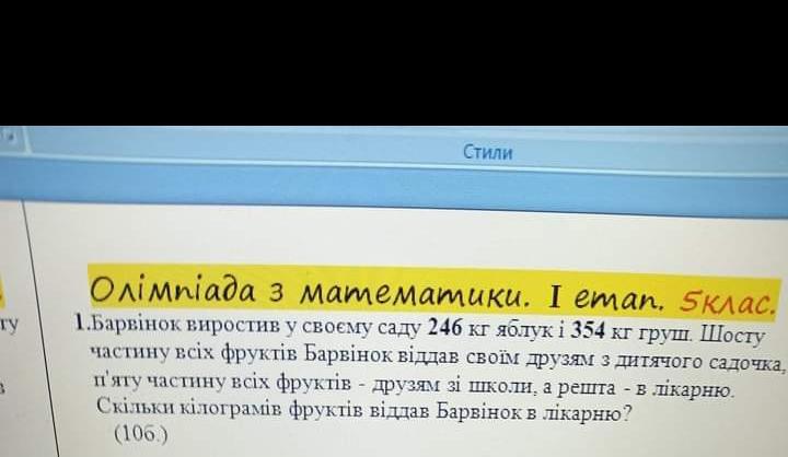1) 246 + 354 = 600 кг - Всього фруктів у Барвінка