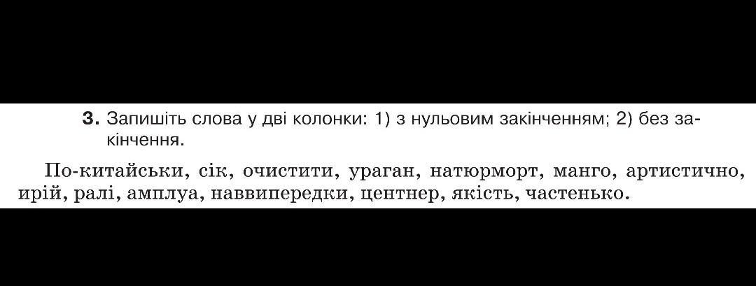 3. Запишіть слова у дві колонки: 1) з нульовим закінченням; 2) без за- кінчення.